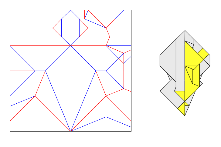 当時、おりがみ新世代のお題板が「座布団小鳥の基本形(座布団の基本形から折り始める小鳥の基本形のこと)」で盛り上がっており、そこへの投稿を意識して創作したため、座布団小鳥ベースの構造になっている。くちばしをインサイドアウトしているように見えるが、実はインサイドアウトしているのは胴体側。白おもてで一度折りたたんだ後(下記展開図左側)、中に入っている色面を表に折り返すことで胴体の色が出てくる(展開図右側)という少し珍しい構造をしている。